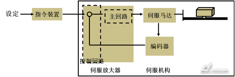 伺服系統(tǒng)是指:以物體的位置、方位、姿勢等為控制量,組成能跟蹤目標(biāo)的任意變化的控制系統(tǒng)。下圖是一個(gè)伺服系統(tǒng)的主要構(gòu)成部分: